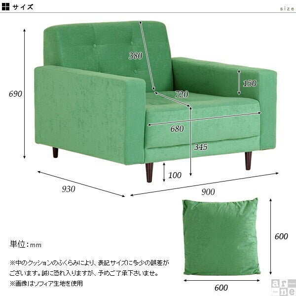 こちらのソファには、ソファ本体と同色の生地で作った60cmクッションが1個付属しています。