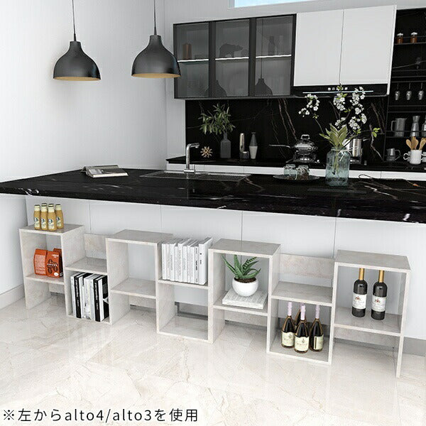 横置きにしてソファのバックシェルフやカウンター下収納に。リビング収納としても高さが出ない分、お部屋に圧迫感を与えず、開放感のある雰囲気に。また、他の家具の幅に合わせてラックを組み合わせる事で無駄なく収納を増やすことが可能。キッチンでは食器棚の代わりとしてや、食材のストック、料理本などもディスプレイを楽しみながら収納できるマルチな飾り棚です。