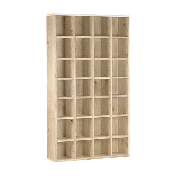 均等に美しく配置された縦板と、可動式の棚板でどんなサイズも収納可能。