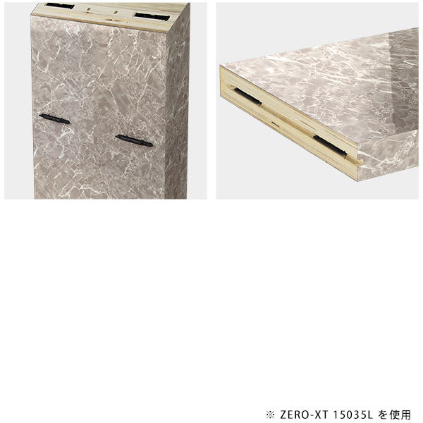 キズや熱、汚れに強いメラミン樹脂化粧合板を使用しています。天板に物を置いてできる擦り傷に強く、熱い鍋やフライパン等を置いても大丈夫です。