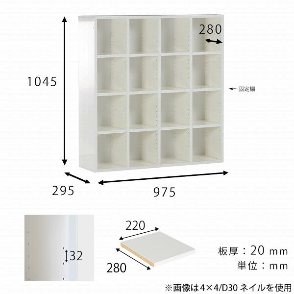 均等に美しく配置された縦板と、可動式の棚板でどんなサイズも収納可能。