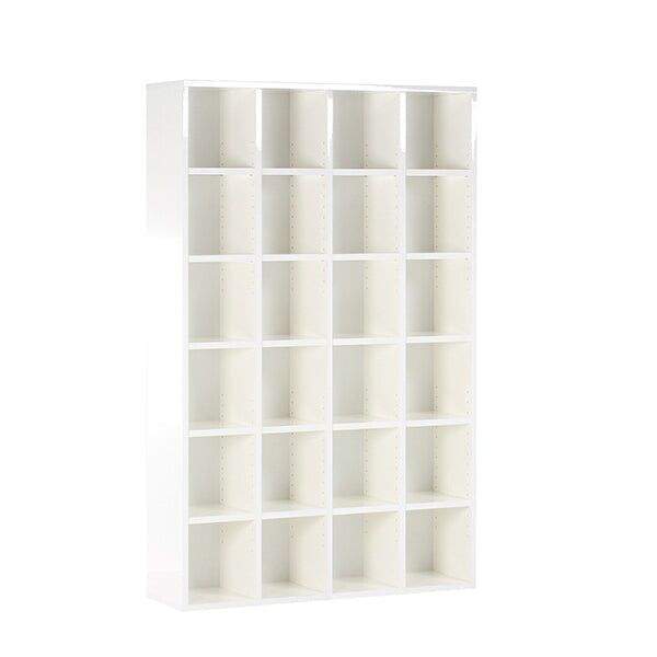均等に美しく配置された縦板と、可動式の棚板でどんなサイズも収納可能。