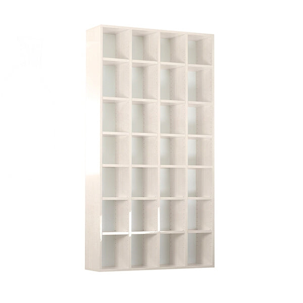 均等に美しく配置された縦板と、可動式の棚板でどんなサイズも収納可能。