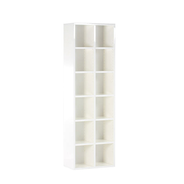 均等に美しく配置された縦板と、可動式の棚板でどんなサイズも収納可能。