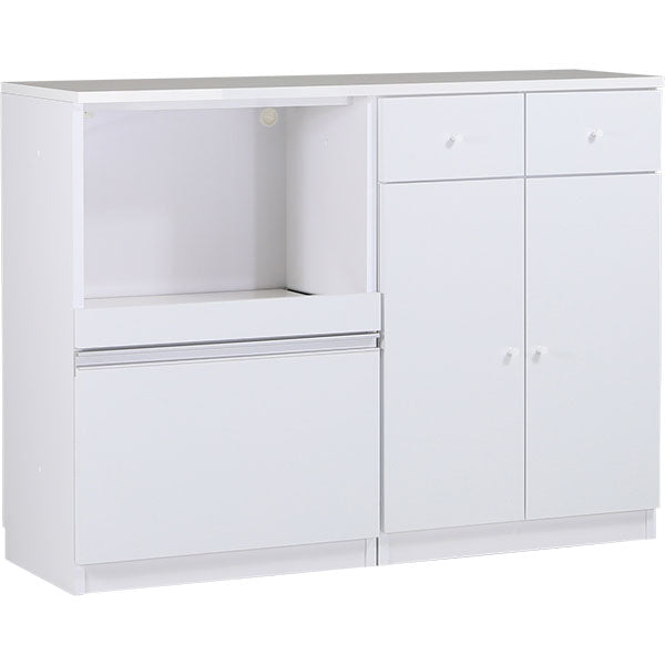 レンジ台には家電製品を置いてもスムーズに出し入れできるスライド棚がついており、1口コンセント付きです。