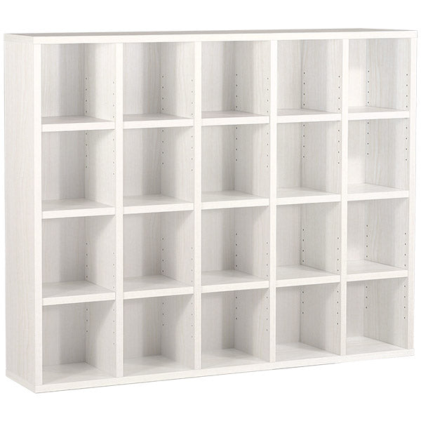 均等に美しく配置された縦板と、可動式の棚板でどんなサイズも収納可能。