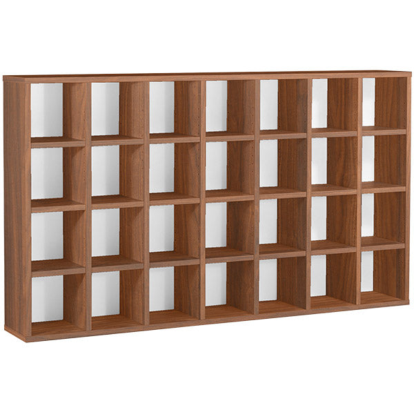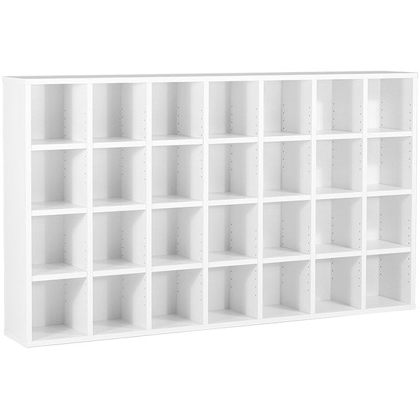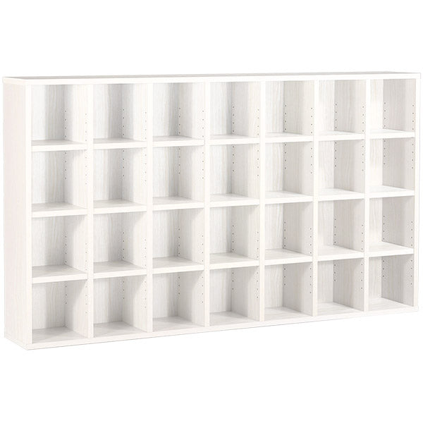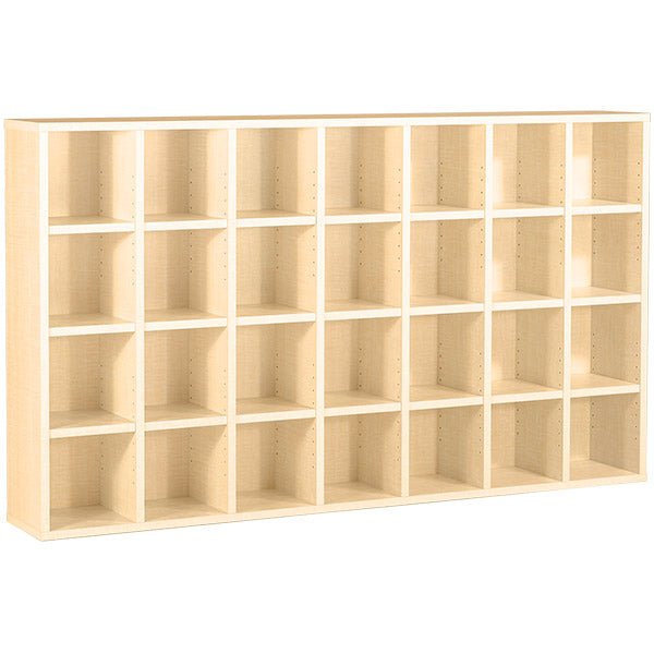 均等に美しく配置された縦板と、可動式の棚板でどんなサイズも収納可能。