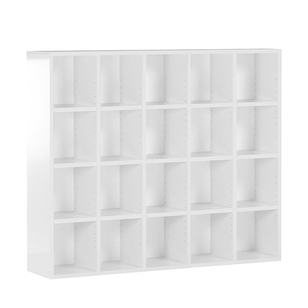 均等に美しく配置された縦板と、可動式の棚板でどんなサイズも収納可能。