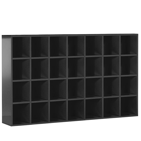 均等に美しく配置された縦板と、可動式の棚板でどんなサイズも収納可能。
