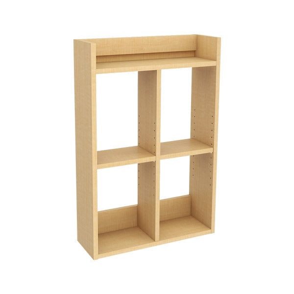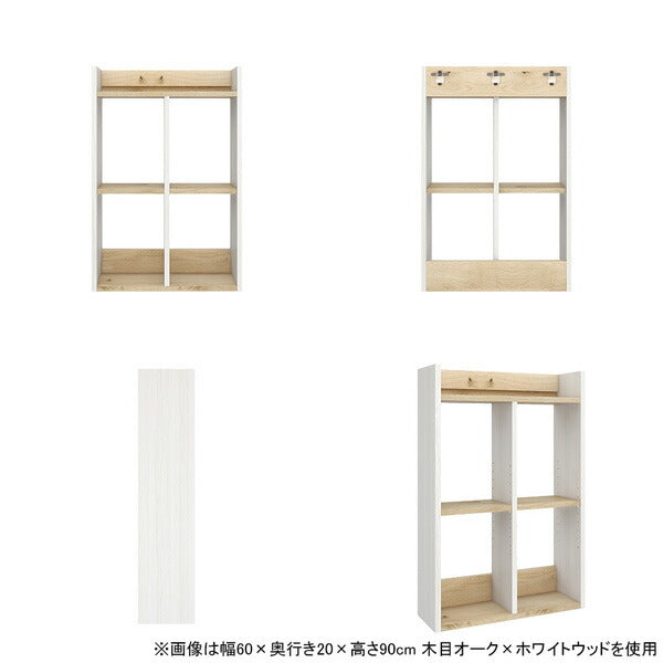 左下:幅60×奥行20×高さ90cm 木目オーク×ホワイト、右下:幅70×奥行20×高さ120cm 突板メープル