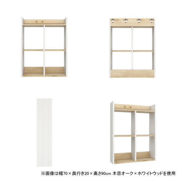 洗面所のタオル入れとして設置しました。もともと置いてあるキャビネットに合わせて横幅を80cmに変更、さらに本体カラーをホワイト、引き戸のみオークに変更対応していただきました。