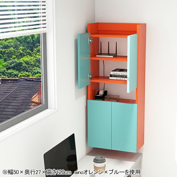 [使用商品] 上:幅50×奥行22×高さ150cm ainoピンク×グレー×オレンジ、下:幅30×奥行17×高さ120cm 木目ナチュラル×ブラックウッド