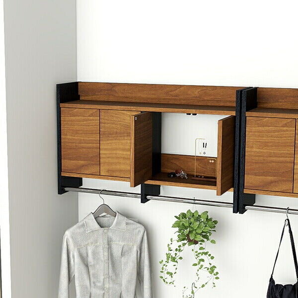 リビングをより機能的にする壁掛けハンガーラック。扉が付いた棚付きシェルフは、細々した生活用品をしっかりと隠せます。また、ハンガーバーにはお気に入りのカバンや洋服もたっぷりと掛けることができるため1台で理想の衣類収納に。コンパクトな洋服掛けとして、大容量のリビング収納家具としてお好みのサイズをお選びください。
