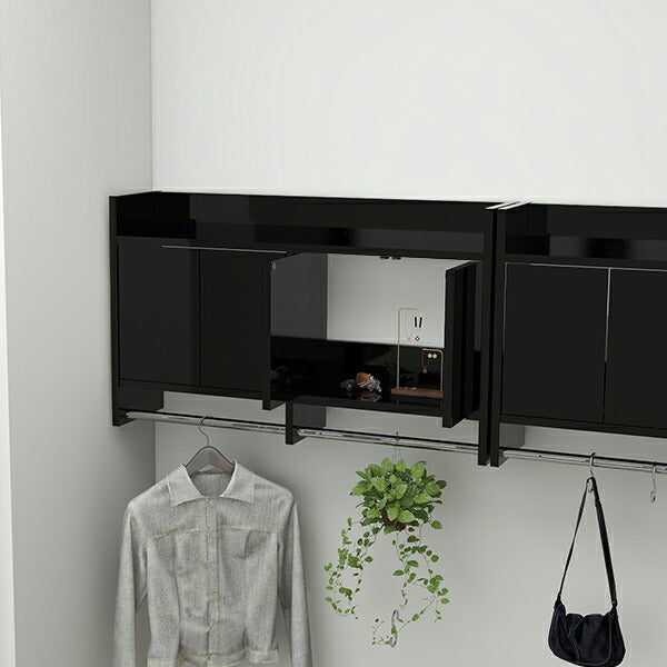 リビングをより機能的にする壁掛けハンガーラック。扉が付いた棚付きシェルフは、細々した生活用品をしっかりと隠せます。また、ハンガーバーにはお気に入りのカバンや洋服もたっぷりと掛けることができるため1台で理想の衣類収納に。コンパクトな洋服掛けとして、大容量のリビング収納家具としてお好みのサイズをお選びください。