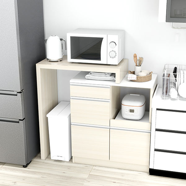 スチームオーブンレンジなどの大型電子レンジも設置可能!スリムなサイズ感で、場所を取らずに使えます。