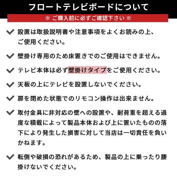 床置き使用不可。テレビ本体は必ず壁掛けタイプをご使用ください。天板の上にテレビを設置しないでください。製品の上に乗ったり腰掛けないでください。